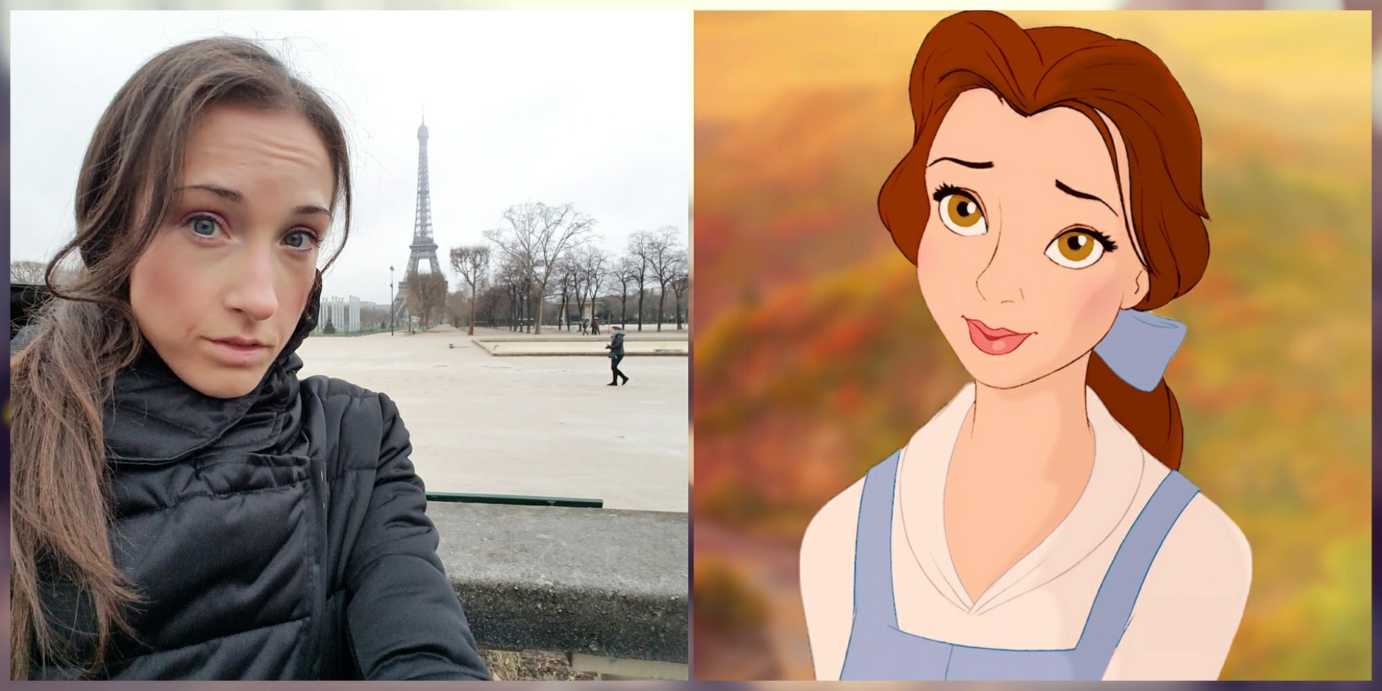 Side-by-side photos of a woman and Belle from Beauty and the Beast