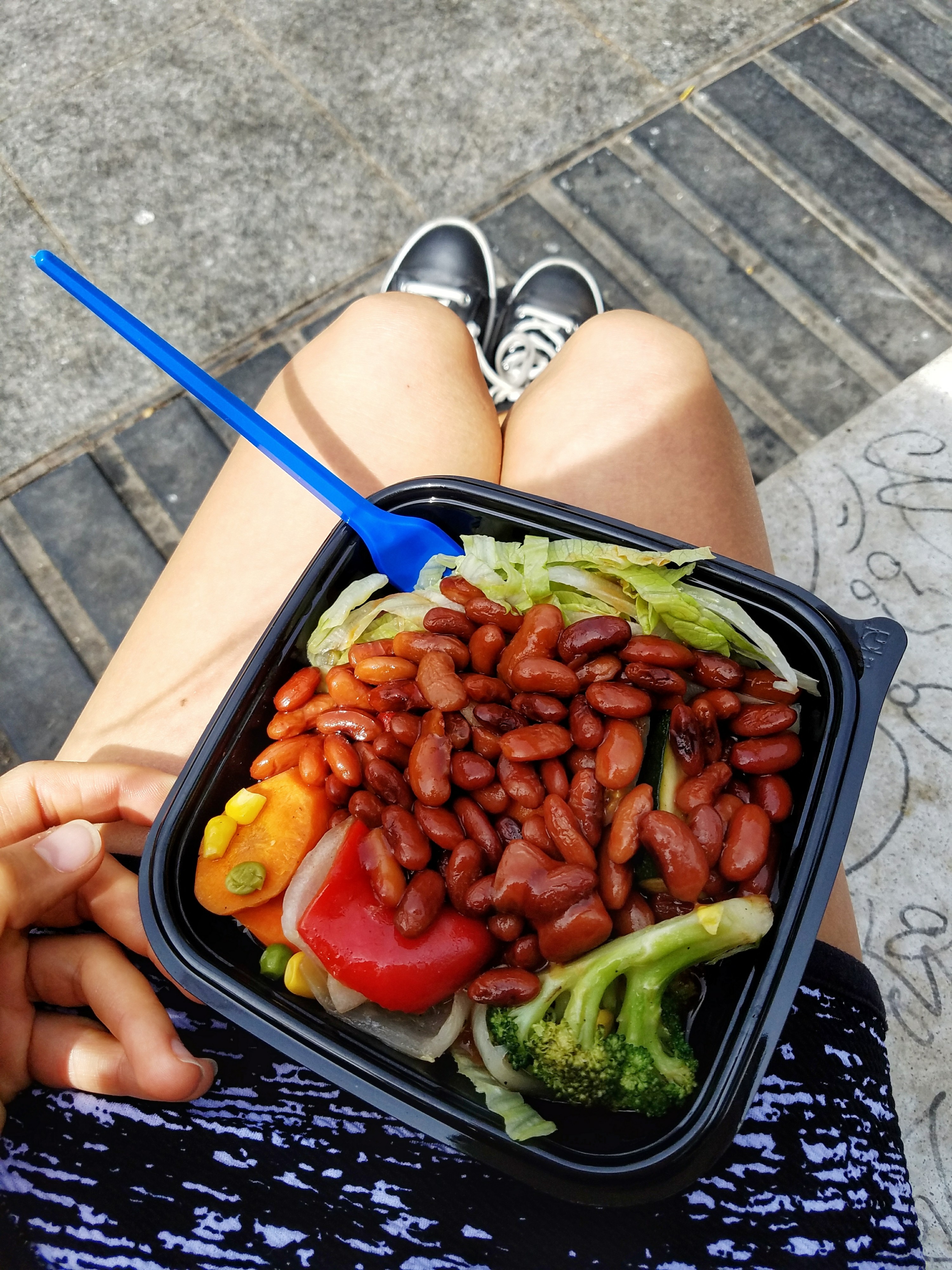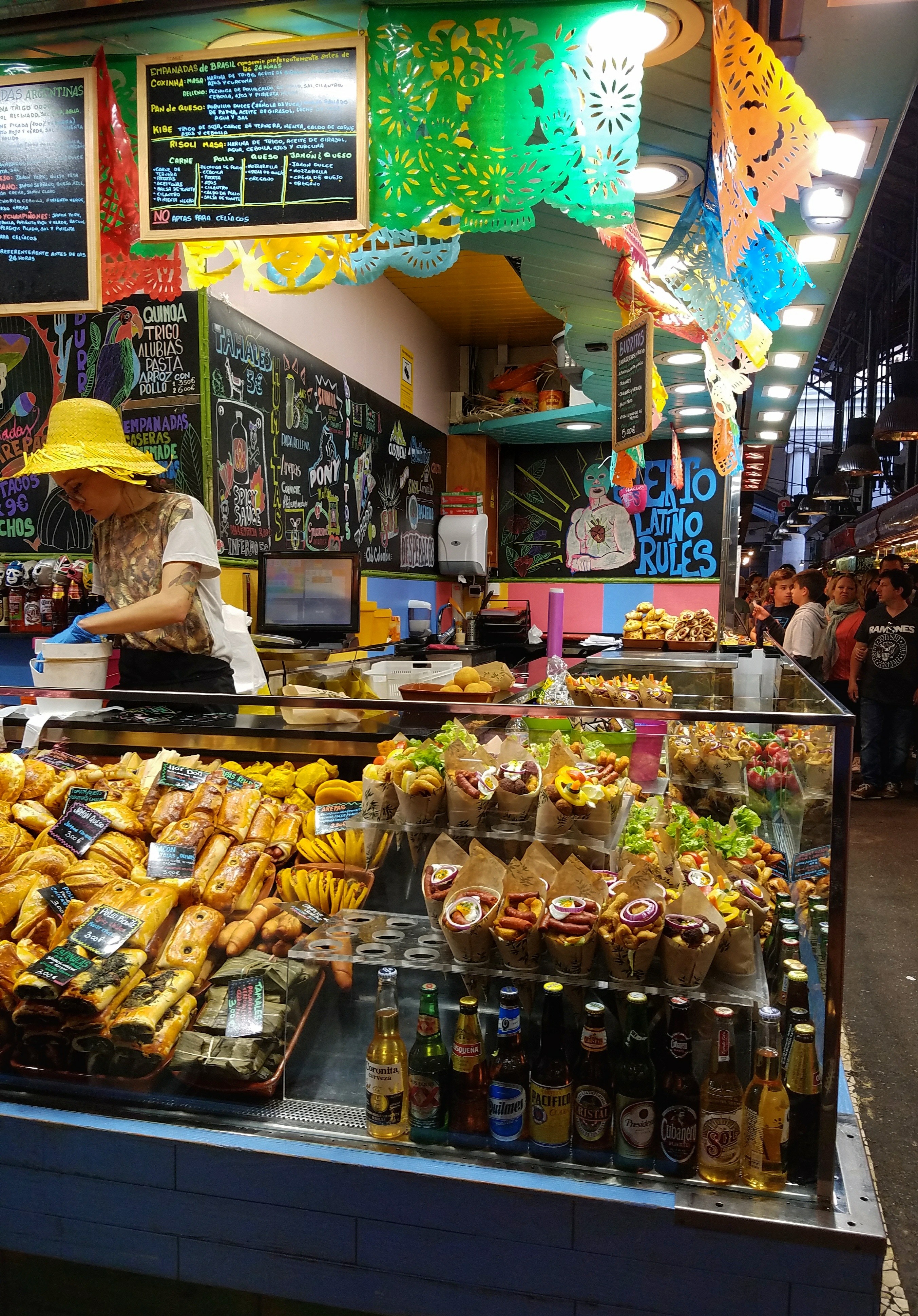 La Boqueria seating is limited and reserved for diners at specific eateries. Since my taco bowl did not come with complimentary seating, I found an empty bench just outside the market and dug in.