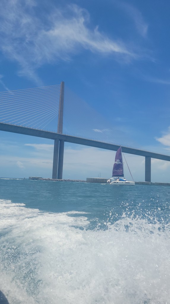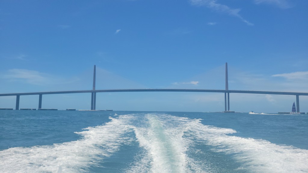 Because we started on the east side of Tampa Bay and we only booked the boat for four hours, we booked it west, across the bay and under the Sunshine Skyway Bridge.
